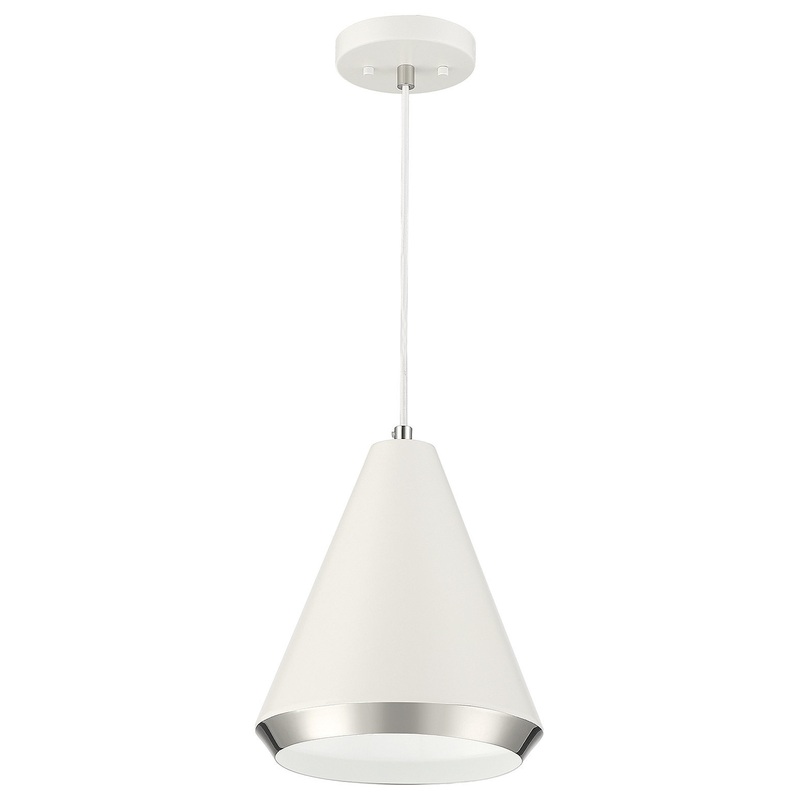 Get contemporary style with a vintage twist when you get this 1-light pendant, featuring a solid conical shade finished in white with polished nickel accents. 12" height, 10" width. Max height 132". Max 60 watt bulb, standard size A19 bulb recommended. LED