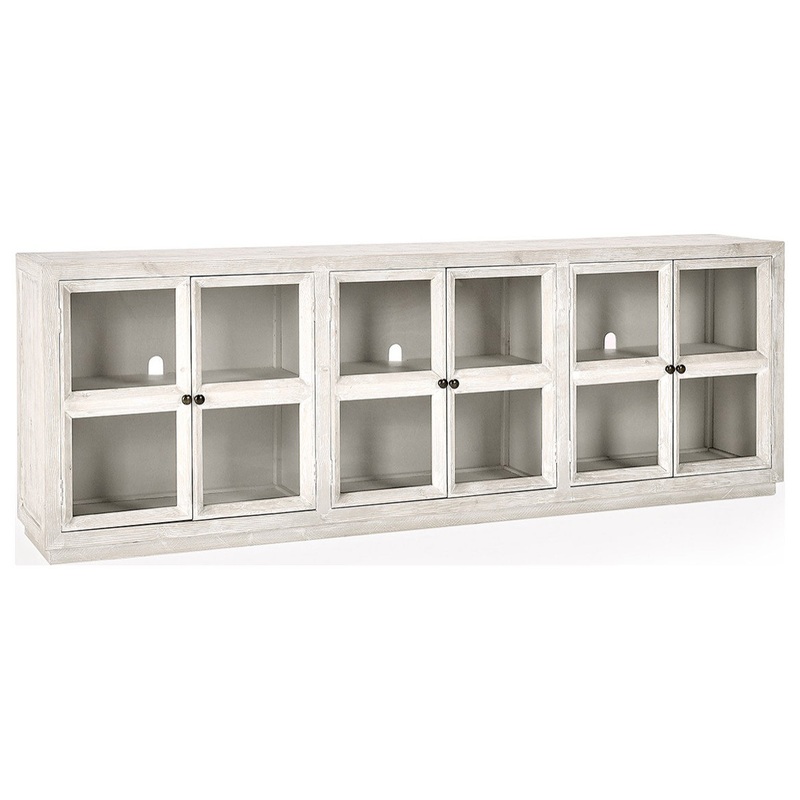 -244 lbsThis large media console’s use of reclaimed pine makes the piece both stylish and sustainable. Its six cabinet doors have glass panes to create a window-like effect. Dishes, serving ware, or other dining accessories can be attractively displayed behind the glass doors. Also, perfect as a media console with fixed shelving and holes for cables on the back.