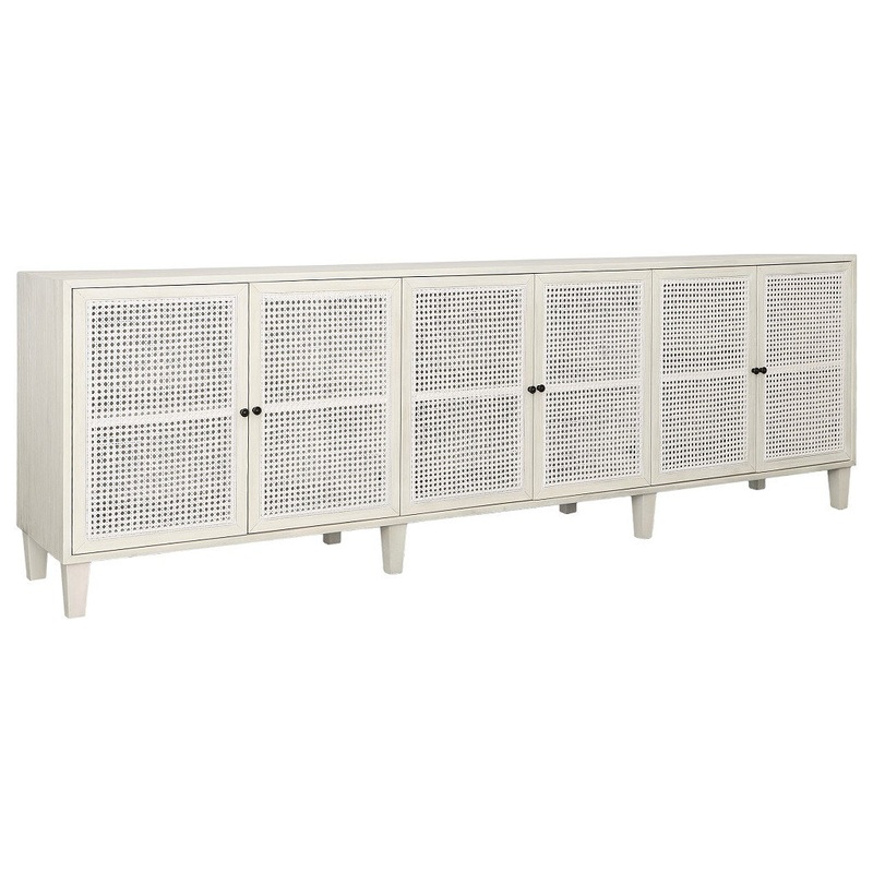 -Stunning long sideboard/media console with rattan doors. Solid Acacia wood in an antique white finish.