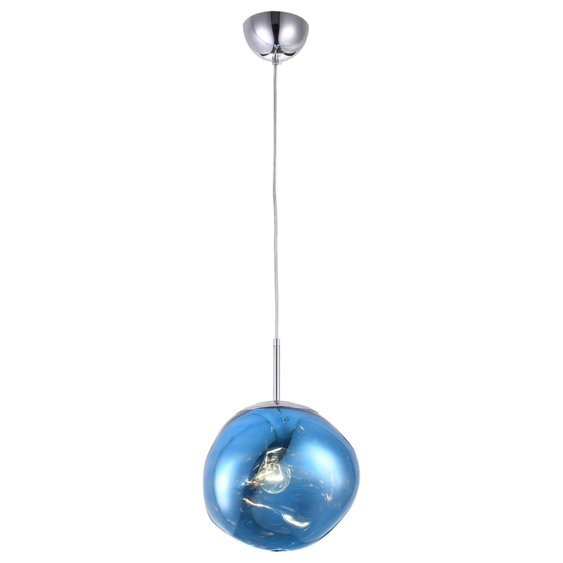 This modern single pendant light is in a blue finish. The frame is made out of metal in chrome color, and it has a blue ORB acrylic shade in blue. This transitional single pendant light can be used in Living Room, Bedroom, Dining Room, Hallway and Kitchen.