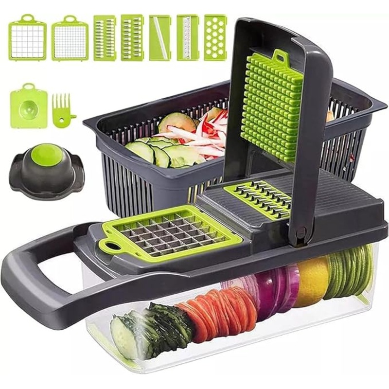 Experience the ultimate in kitchen convenience with our 16-in-1 Multifunctional Vegetable Chopper. This manual mandoline and vegetable cutter is designed to make food preparation a breeze, saving you time and effort in the process.Our vegetable chopper is equipped with multiple interchangeable blades and attachments, allowing you to perform a variety of tasks with ease. From chopping and slicing to dicing and grating, this kitchen tool has got you covered.Product Features– 16-in-1 Functionality: One tool for multiple tasks, including chopping, slicing, dicing, grating, and more– Manual Operation: Easy to use and clean, with no electricity required– Interchangeable Blades: Multiple blades and attachments for various tasks– Adjustable Thickness: Control the thickness of your slices and cuts with ease– Durable Construction: Built to last with high-quality materialsPerfect For– Chopping vegetables and fruits– Slicing meat and cheese– Dicing potatoes and carrots– Grating ginger and garlic– Preparing salads and sandwiches– Cooking and baking