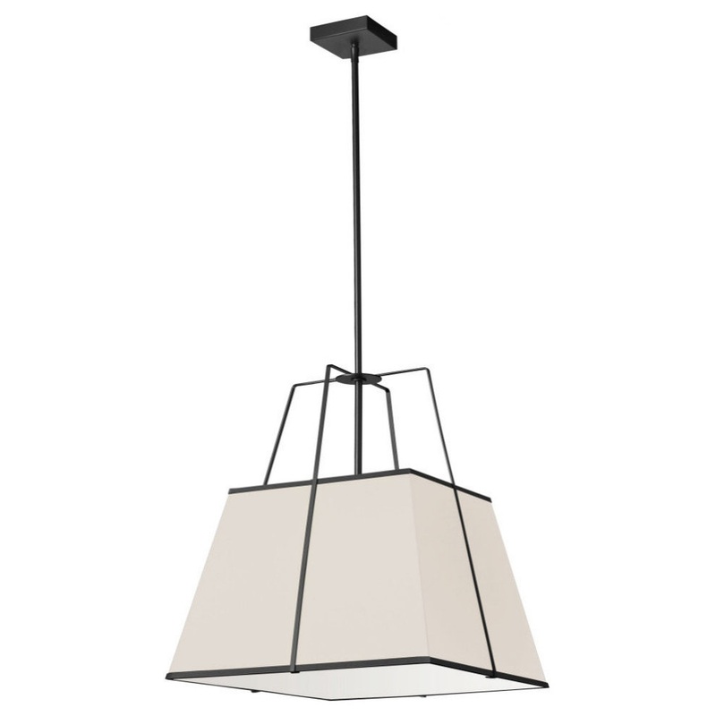 18" Black Trapezoid Pendant with Cream Shade. This single light LED compatible is recommended for the ceiling in a Foyer or Hall. It requires 1 incandescent bulb, is covered by a 1 Year Warranty and is suitable for either a residental or commercial space.