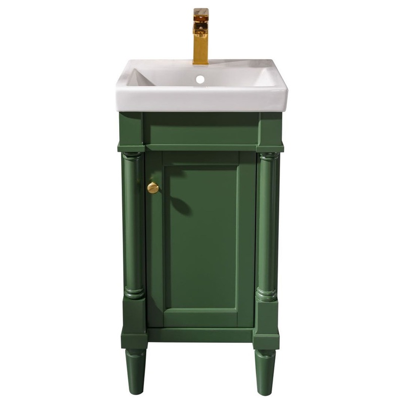 -Dimensions: L:13.5 x W:17.5 x H:34.5 -Finish: VOGUE GREEN -Counter Top: Ceramic -Sink: Integrated -Faucet: Not Included -Faucet hole : Single Pre-drilled hole -Matching Mirror: Sell Seperately ( WLF9018-VG-M ) -Mirror Dimensions: L:16 x D:1 x H:30 -Wood M