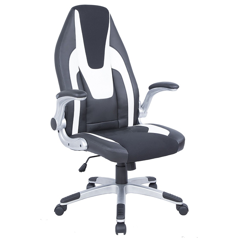 This modern pneumatic adjustable height computer chair is a great choice as an office or even a gamer computer chair. It features a sturdy base with hooded dual-wheel nylon castors that prevent the wheels from jamming and facilitates mobility. It also has 360 degree swivel rotation as well as a butterfly mechanism for ergonomic adjustment controls. The seat, back, and arms have faux leather upholstery. You can also pull the arms up if you prefer not to use armrests.