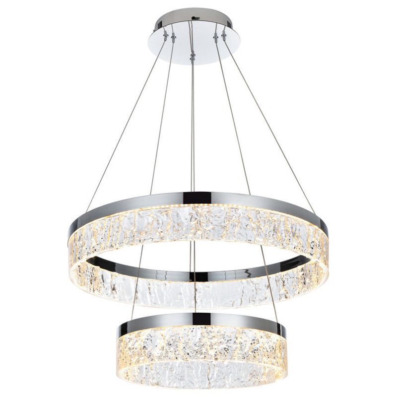 Illuminate your space with our 22-inch chandelier, showcasing a distinctive two-tier ring design that gracefully diffuses ambient light through captivating ripple-cut crystal elements, adding a touch of modern elegance to your surroundings.
