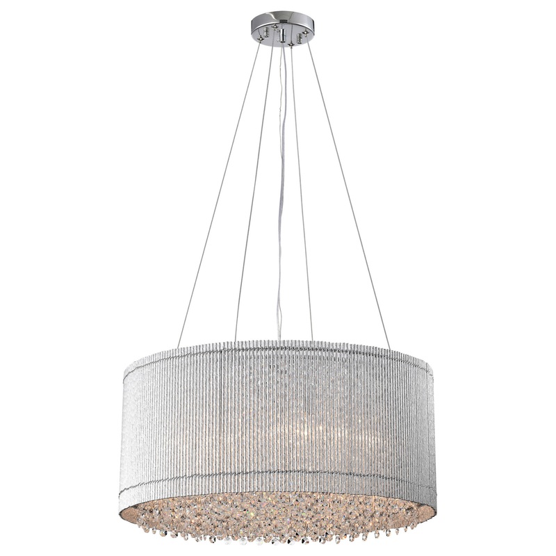 This modern and contemporary 5-light chandelier features etched chrome and sparkling crystal strands that add glam lighting to the home. The classic drum chandelier shade is formed by etched tubes that surround the bulbs to reflect the lights and crystals. The shiny chrome finish of this crystal chandelier complements contemporary furnishings for a timeless appearance. Hanging by four 59 in. wires, this light fixture may be adjusted to suit any ceiling height. The chrome finish, crystal strands, and drum shape make this light the perfect lighting solution as an entryway, dining room, or bedroom chandelier.