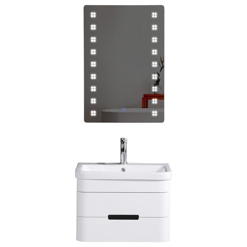 -Dimensions: L:18x W:24 x H:18 -Finish: White -Counter Top: Ceramic -Sink: Integrated -Faucet: Not Included -Faucet hole : Single Pre-drilled hole -Mirror: LED Mirror Included -Mirror Dimensions: L:21.6 x H:32 -Vanity Material: PVC -Water Sealer: Water Res