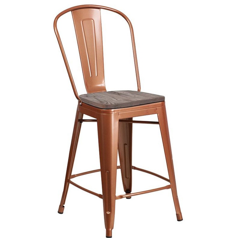 The high back, Bistro style counter stool will give your dining room or bar decor a refreshing rustic feel with its metal and wood features.This stylish metal stool features a curved back with a vertical slat and a cross brace under the seat for added supp