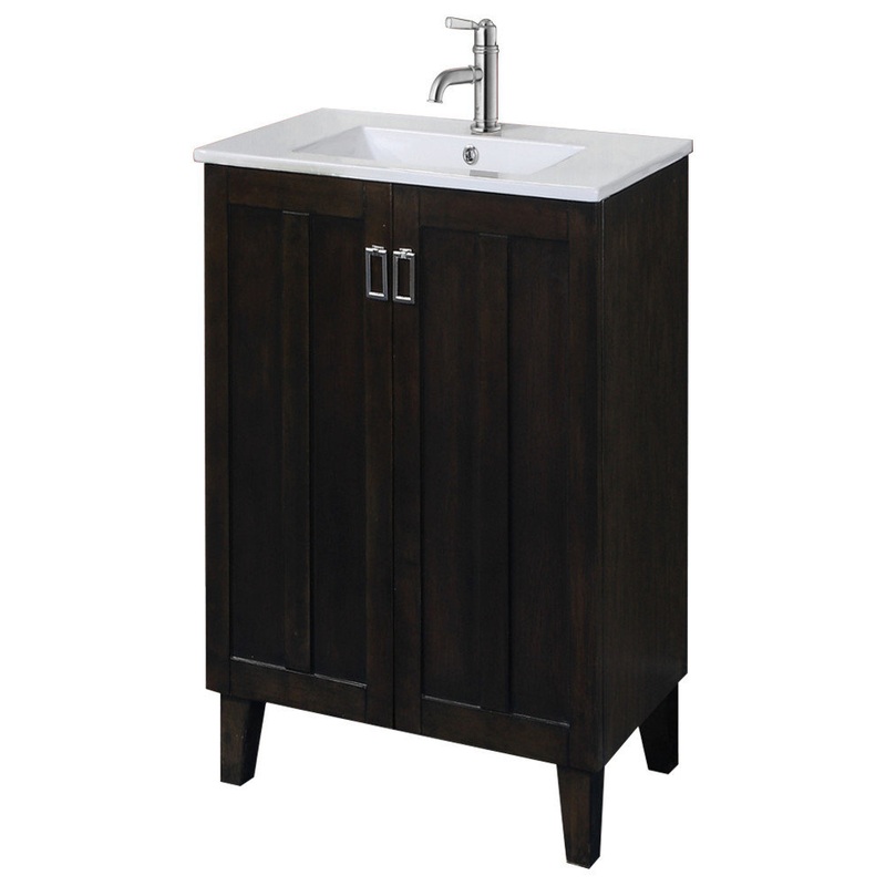 Add a timeless touch to your bath with the Solid Vanity. This stunning vanity features a rich dark brown color and includes a ceramic basin. Stow away toiletries and towels in the spacious cabinets, and add your own personal touch with a unique, stylish faucet (not included). At 24 inches wide, this vanity is appropriate for both petite powder rooms and full-sized en suites.