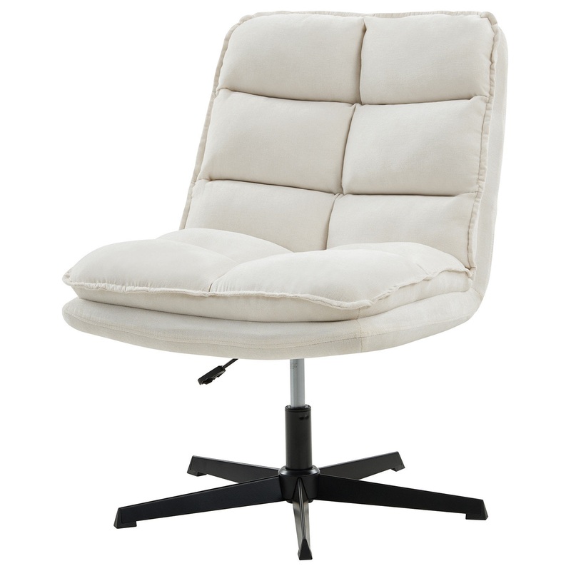 This office chair features a unique armless design, allowing for comfortable cross-legged seating. It offers 360-degree rotation for easy movement and adjustable height to suit various desk levels. The tufted design of the chair adds a touch of elegance, w