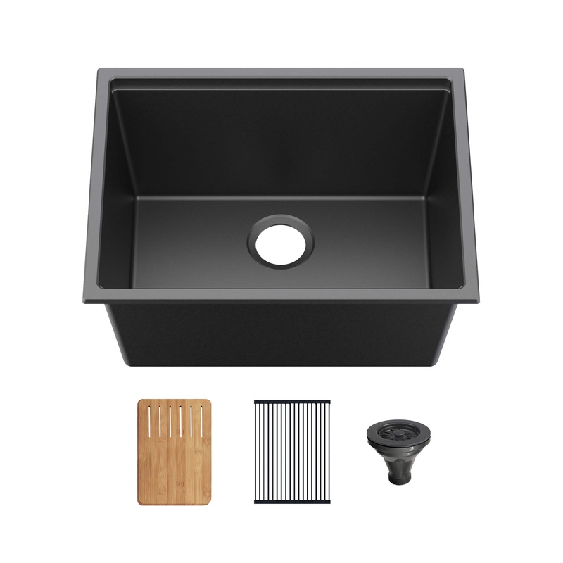 -Sleek Design: The matte black finish of the quartz composite sink adds a touch of modern elegance to any kitchen, making it a stylish focal point.Durable Material: Constructed from high-quality quartz composite, the sink is resistant to scratches, stains,