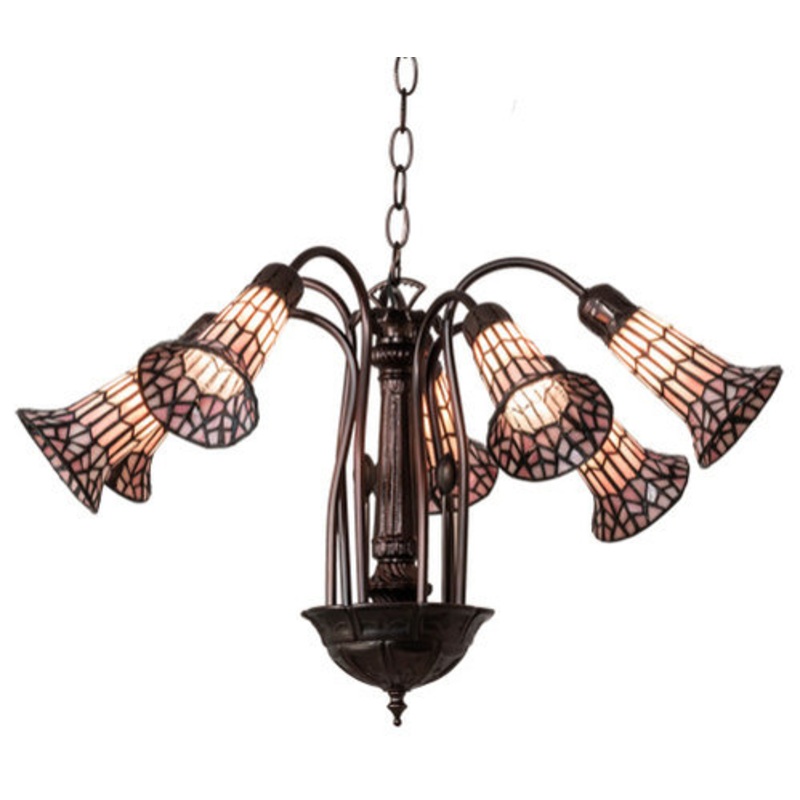 One of the most popular Louis Comfort Tiffany styled fixtures on the market. This chandelier re-creates his famous Favrile design from the early 1900s. This exquisite chandelier offers an attractive; delicate design featuring seven shades created with the famous Meyda Tiffany copperfoil construction. Pink and White Lily shades are suspended from stems delicately winding above a Lily pad base finished in Mahogany Bronze. Overall height ranges from 19 to 57 inches as the chain length can be easily adjusted in the field. UL and cUL listed for damp and dry locations. Each shade is a unique work of art with color variations based on natural ingredients inherent in the glass. Contact us if color matching is critical when ordering multiple items.