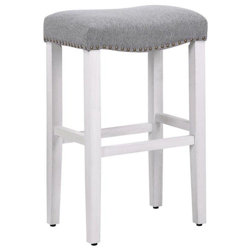Give your kitchen a stylish update with this attractive Barstool. With solid rubberwood legs and seat frame, the stool is sturdy for safe and reliable sitting. The gray upholstered seat with bronze nail head trim makes it an eye-pleasing piece to liven up