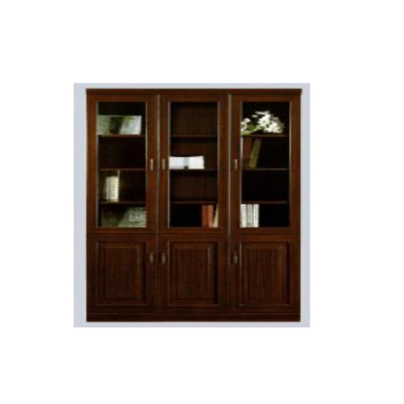 SturdyLaminate board with veneer cabinet with 3 sections. Glass swinging doors in each section. Shelves in each section for maximum utilization.