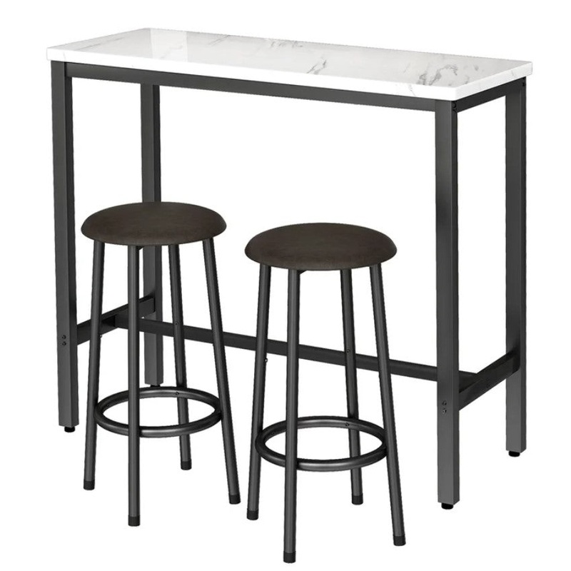 What’s Included?Table2 ChairsFeaturesMade of a powder-coated steel frame, this 3-piece bar table set features an elegant faux marble table top, offering an ideal space for a quick breakfast or enjoying an appetizer plate and a cup of hot coffee. Come with 1 rectangle bar table (W39.4”x D15.7”x H35.6”), and 2 round stools (Dia 11.8”x H23.8”), this bar set is a great choice to use in compact spaces like the kitchen, or dining room, balcony, etc. Upholstered round stools designed with footrests for relieving fatigue, and foot pads attached on the bottom to protect floors.Dining for 2 or More: Enjoy a quick breakfast with this 3 pieces bar table set or combine 2-3 sets for a big family and friends gathering. The stylish design makes this set easily match the different home decor and it would become a great solution for compact spaces.Easy to Assemble: Assemble this 3 pieces bar table set with a clear instruction manual included. Professional customer service will be happy to help you with any questions or concerns you may have.