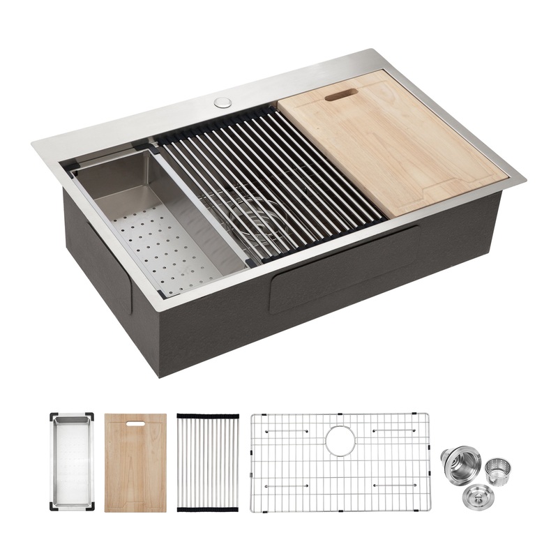 Kitchen Sink Size and Package:30″x22″x9″ (minimum cabinet size: 33 inch). Package comes in a 30 drop in single bowl kitchen sink, drain assembly, bottom rinse grid, cutting board, rollup rack and drain basket,cutout template and installation introuction.