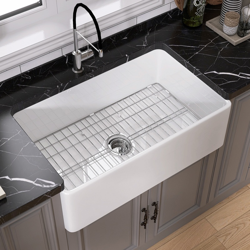 PREMIUM ACCESSORIES & PACKAGEGETPRO curve fireclay farmhouse sink included customized 304 stainless steel bottom grid and strainer.Bottom grid is helpful to filter water and prevent possible hit damage,support capacity up to 100LBS.Strainer is necessity for stopper or garbage disposal.GETPRO white kitchen sink comes with sturdy foam package.