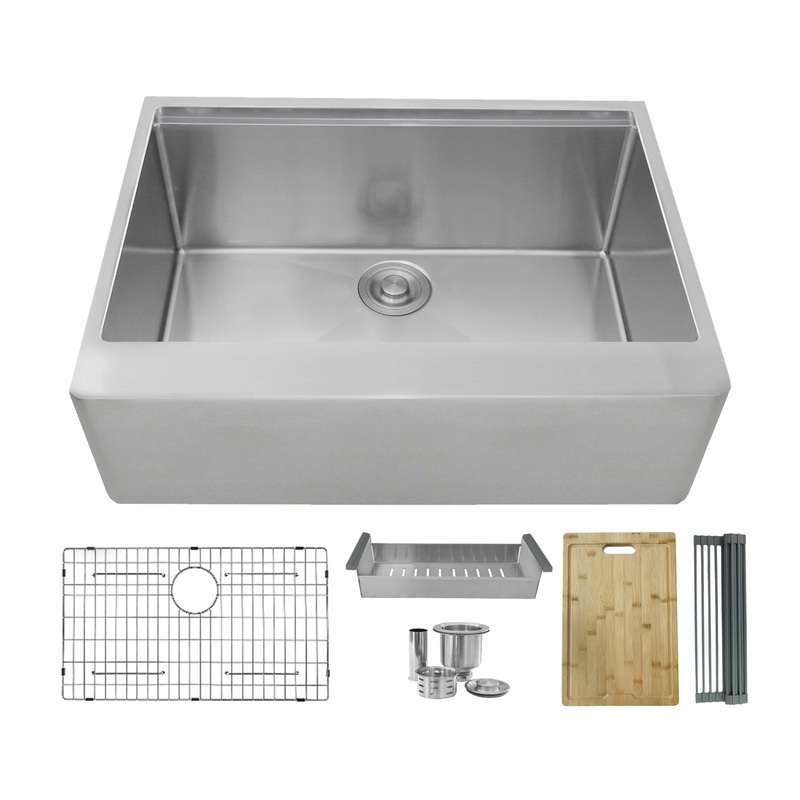 Introducing our stainless steel single bowl workstation apron kitchen sink. Become your own private chef with all the features this workstation kitchen sink has to offer. Not to mention the beautiful apron/farmhouse look that will completely transform your kitchen design. This 30 x 22-inch stainless steel single bowl workstation sink is made of premium 16 gauge stainless steel. So versatile, this workstation kitchen sink come with a protective stainless steel bottom grid, luxury stainless steel basket strainer, a stainless-steel colander, a bamboo cutting board, and a roll-up drying rack. All these included accessories fit perfectly over the kitchen sink. This single bowl workstation sink also comes with installation instructions and mounting brackets. The 10-inch-deep bowl allows you to wash larger pots and pans and help hide dirty dishes for later washing. This single bowl workstation apron kitchen sink is equipped with a soundproofing system including a protective stone guard coating and extra-thick rubber pads to keep vibrations and loud sounds at bay while in use. This coat is sprayed underneath the sink to prevent water condensation as well. The drain in this stainless-steel workstation apron sink has been placed towards the rear to allow for optimal drainage and more space under the kitchen cabinet for storage. The tight 10mm radius corners of this apron sink are perfectly blended through an automated machine buffing system, and carefully hand polished, for a luxurious finish.Rounded corners make maintenance as simple as wiping the surface with a damp cloth. This is truly a home chefs dream workstation apron kitchen sink, prep food over the kitchen sink with our amazing accessories, save space on your kitchen countertop and give your kitchen a whole new look.