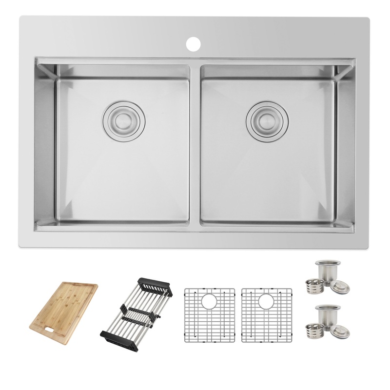 Introducing Azuni's newest top-mount workstation sink. This stunning 31" x 20.5" double bowl workstation kitchen sink is everything you need for your kitchen. This workstation kitchen sink has a smart design with an integrated ledge that allows the include