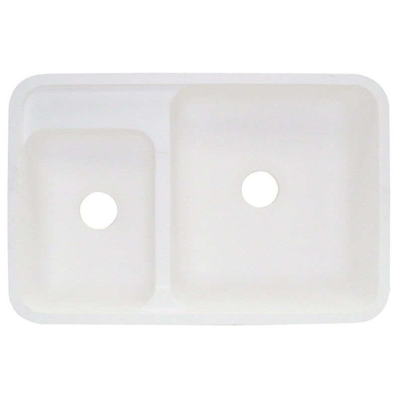 -32" x 21" x 9" Gourmet large/small double bowls -Under counter mount kitchen sinkSolid surface material is non-porous. Scratches and stains like coffee, juice, berries and burns are easily removed with abrasive cleaners, restoring and renewing original fi