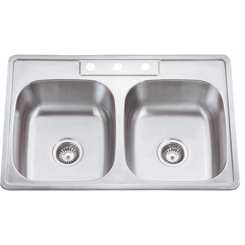 Stainless Steel Drop-In Kitchen Sink with Two Equal Bowls. Three Plumbing Holes on Deck in 8″ Spread. 304 SS with Satin Finish. Insulated Bottom.