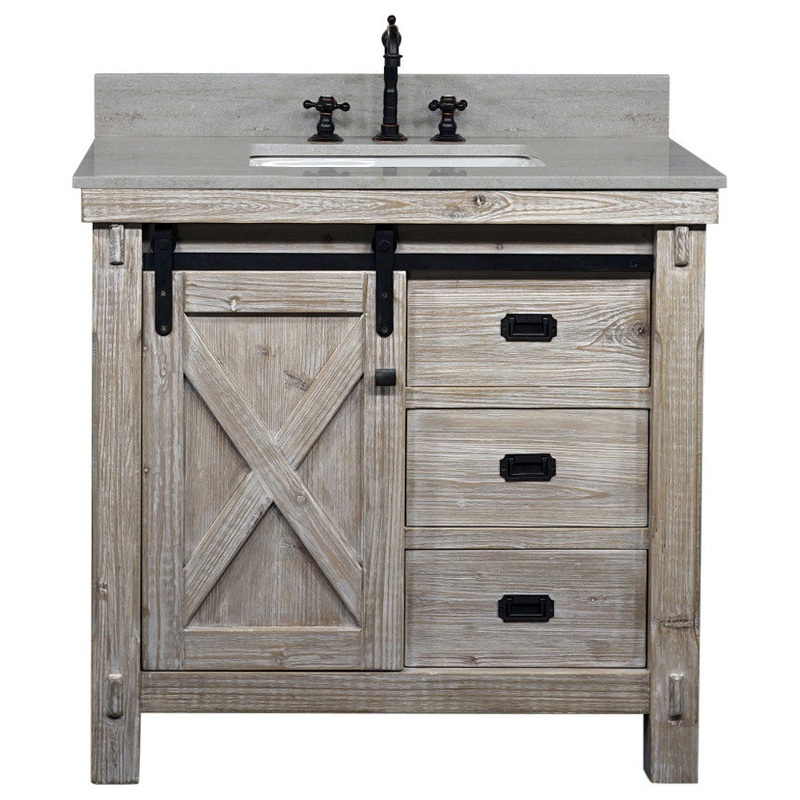 This Rustic Barn Door Style Bathroom Vanity will be perfect for any bathroom. This new creation of Infurniture comes in Driftwood and White Wash finish with sliding barn door that gives this vanity a unique style. This Bathroom Vanity has 7 options of top