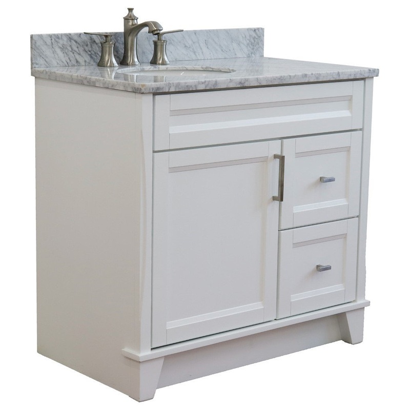 The Terni collection by Bellaterra Home features simple style bathroom vanities that can integrate seamlessly with any home design. From a simple or to the grand home design, you will appreciate this beautifully crafted piece of furniture as the focal point in your bathroom. The structure of the cabinet is built with solid oak. This vanity has two drawers and a cabinet door that opens to a large ample storage space. The drawers are constructed with English dovetail and are installed with smooth full extension glides to provide durability. This vanity features brushed nickel finish hardware and a beautiful counter top that is pre-sealed and polished for added protection. The bathroom vanity top is preinstalled with a white cUPC certified ceramic sink.