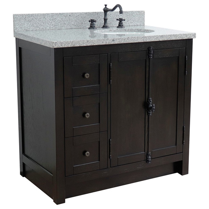 The Plantation collection by Bellaterra Home features Plantation Style bathroom vanities that can accomplish any home design. From the cottage to the cabin or to the grand home design, you will appreciate this beautifully hand crafted piece of furniture as the focal point in your bathroom. The Plantation style wrought iron finish hardware enhances the unique look of this piece of art. The vanity is made with solid oak and plywood, topped with ash veneer to give the texture. It is hand applied with multiple layers of ecofriendly stain and top coat to prevent pealing, cracking and fading. The interior finish is consistent throughout and matches the exterior finish. The structure of the cabinet is built with solid oak and has full corner block on all corners for stability and to also provide additional support for the counter top. It has one interior adjustable shelf for storage and a big opening for plumbing installation. This collection offers a variety of finishes. Each cabinet is configured to work with our variety of countertops or any standard sized tops. This vanity is available in: Brown Ash (Dark brown), Glacier Ash (White), Gray Ash (Light gray).This elegant bathroom vanity top features a 1.3 in. Gray granite preinstalled with a white undermount cUPC certified oval ceramic sink and a matching 4 in. H. backsplash is available for purchase to complete the utmost beauty and functionality. It will easily match many home interiors. The vanity top is pre-drilled with 3 holes for an 8 in. widespread faucet and fits directly on top of a standard vanity cabinet (sold separately). Bellaterra Homes counter tops are pre-sealed and polished for added protection. All genuine stone material has its variation of veining pattern and color; every top will be slightly different.