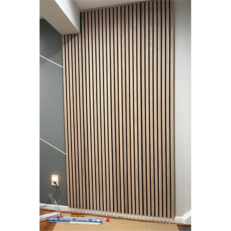 Enhance your space with the acoustic slat paneling for walls and ceilings. The panels are made from veneered lamellas on the bottom of a specially developed acoustic felt created from recycled material. The handcrafted panels are not only designed to fit in with the latest trends but are also easy to install on your wall or ceiling. They help to create an environment that is not only quiet but beautifully contemporary, soothing, and relaxing.FeaturesWooden slat panels can be widely used on walls and ceilings, in the living room, corridor, kitchen, children’s room, bedroom, or office. They are also suitable for public communities, shops, restaurants, etc.This panel exudes minimalism and natural beauty. It will be a perfect interior match with a natural warm luster.The bottom is a specially developed acoustic felt made from recycled materials with sustainable recycling properties.Soundproof boards are handmade from the highest quality materials.