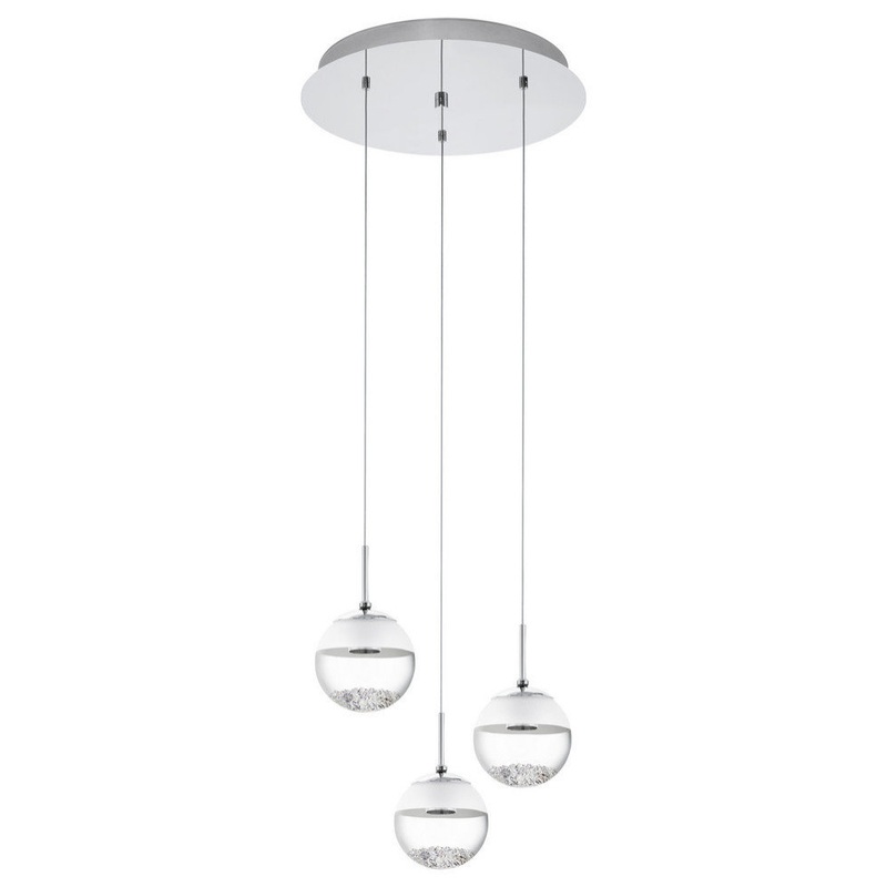The Montefio 1, LED Staircase Pendant by Eglo introduces a fresh design in crystal lighting. The classy design has a shiny chrome finish with a clear and frosted glass globe and individual crystal pieces where the direction of the warm white light shines t