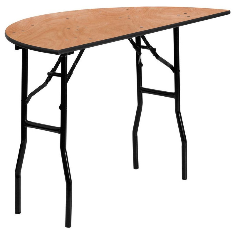 Be ready for your next event with this half-round wood folding table that is a great option for special event planners, catering companies and banquet facilities. The plywood tabletop is 4' in diameter, half an inch thick, and will comfortably seat up to 3