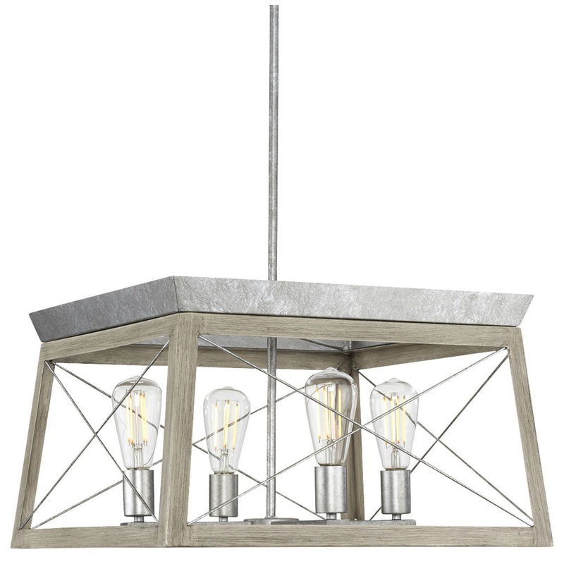 Create a rustic atmosphere with a chandelier from the Briarwood Collection. Light sources exude a comforting country glow through the X-brace design reminiscent of country barn doors and rustic farmhouse gates. The faux wood frame is coated in a bleached oak finish complemented by galvanized accents. Compatible with dimmable bulbs.