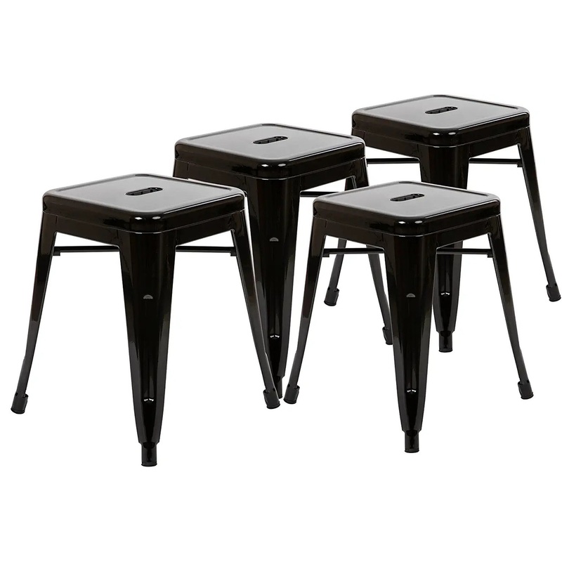 -Set of 4 Space saving indoor dining height stools; Solid structure suited for both commercial and residential use; Can be stacked up to 10 high for storage or routine floor maintenance -MODERN DESIGN: Backless square metal stool fits in multiple contempor