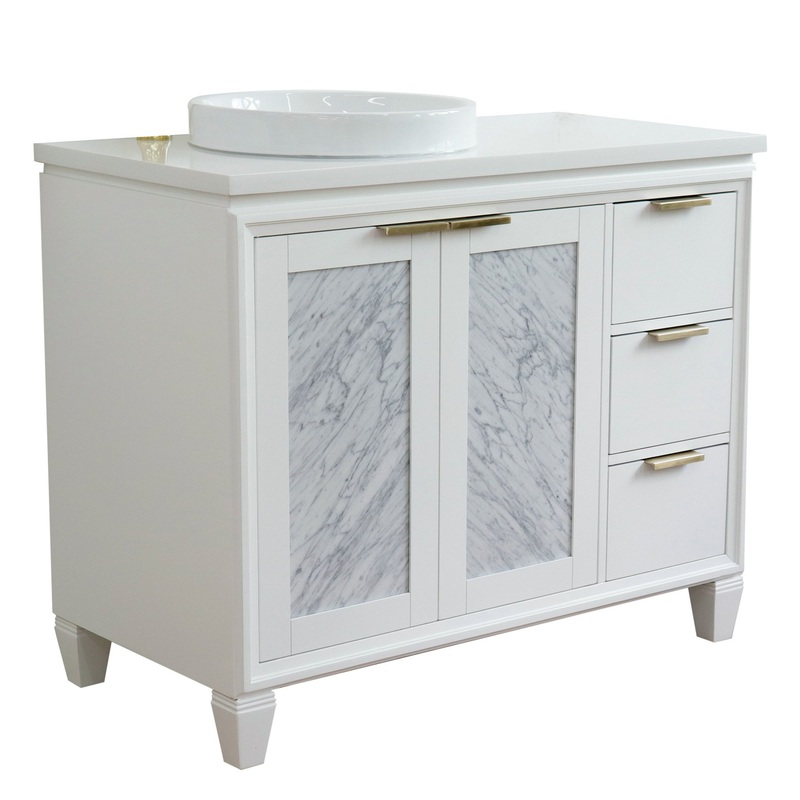 The Trento collection by Bellaterra Home features freestanding style bathroom vanities that can integrate seamlessly with any home design. From a simple or to the grand home design, you will appreciate this beautifully crafted piece of furniture as the focal point in your bathroom. The structure of the cabinet is built with solid oak. The vanity has three drawers and four cabinet doors that open to a large ample storage space. The drawers are constructed with English dovetail and are installed with smooth full extension glides to provide durability. The doors have genuine Italian Carrara marble inserts which make this vanity simply more elegant. This vanity features gold finish hardware and bathroom vanity top is preinstalled with white cUPC certified ceramic sink and a beautiful counter top that is pre-sealed and polished for added protection.