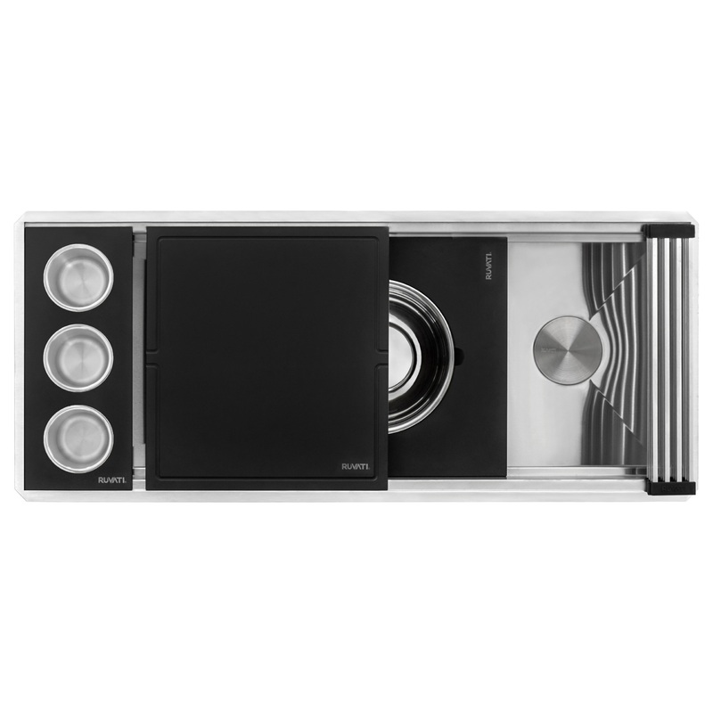 Ruvati has revolutionized their workstation sink series with the Dual-Tier Nova collection featuring black solid composite accessories. The patented dual-tier ledge includes two tiers of tracks that accommodate more accessories, enhancing functionality and