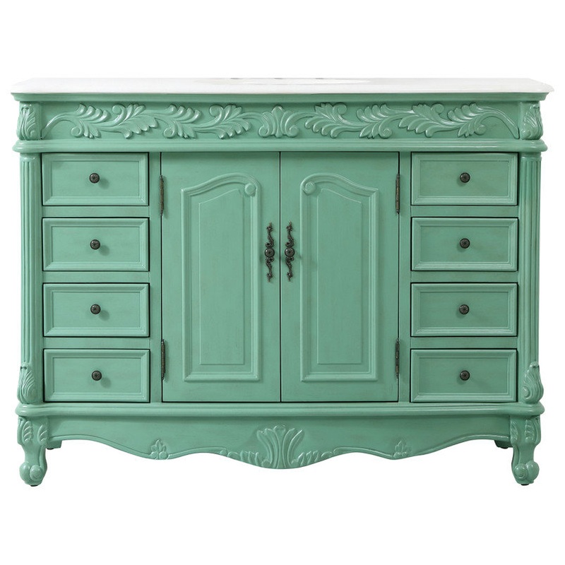 -Hand painted in vintage mint finish with distress paint applicationcomes with an off-white marble top with slight brown veining and bevel edge design, please note that due to the natural characteristics of the stone, the color and/or pattern of each countertop may vary from the pictures.