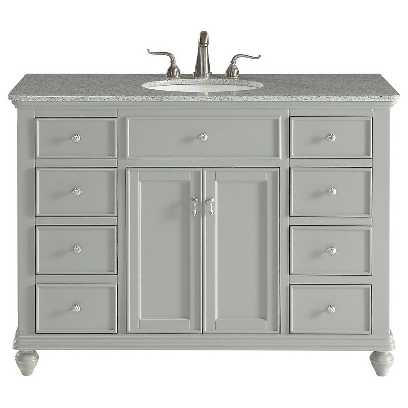 A sleekly styled 4 doors and 8 drawers, granite-topped bathroom vanity like this can only bring a smile of appreciation for its simple beauty and clean lines. With an authentic Kashmir white granite counter top, oval white porcelain sink, hand painted soft grey cabinet, 2 soft-close center doors with a shelf inside, 4 side drawers on each side, brushed steel hardware and carved bun feet, this elegant, transitional vanity balances form and function. Measurements: W48 xD21 xH35Available at AppliancesConnection Features: authentic Kashmir white granite counter top oval white porcelain under mount sink Made of Solid wood and MDF 2 soft-close doors Includes one shelf Faucet is not included fully assembled
