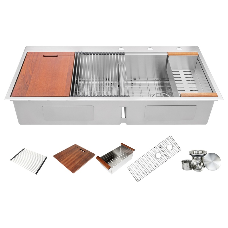 -Luxurious brushed stainless steel finish.The Premium Package Includes: 1 x Stainless Steel Sink, 1 x Stainless Steel Dish Rack, 1 x Stainless Steel Colander, 1 x Cutting Board, 2 x Protective Bottom Grids, 2 x Drain Cover Caps, 1 x Basket Strainer, mounting hardware and cutout template.