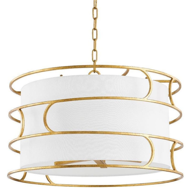 5 Light Chandelier-15.25 Inches Tall and 25.25 Inches Wide-Vintage Gold Leaf Finish . Collection: Rochester Parkway Material: Steel Finish Color: Vintage Gold Leaf Width: 25.25″ Height: 15.25″ Lamping Type: Incandescent Number Of Bulbs: 5 Wattage: 60 Watts Moisture Rating: Damp Rated Desc: A traditional drum shade gets an elegant makeover when wrapped in vintage gold leaf or forged iron. Swirls of metal surround the shade creating an overall streamlined shape with a relaxed vibe and a fresh feel. Light fills the white linen shade with a soft glow and reflects beautifully off the metal frame around it. Available as a semi flush and a pendant in three different sizes there’s sure to be a Rochester Parkway to suit any space.