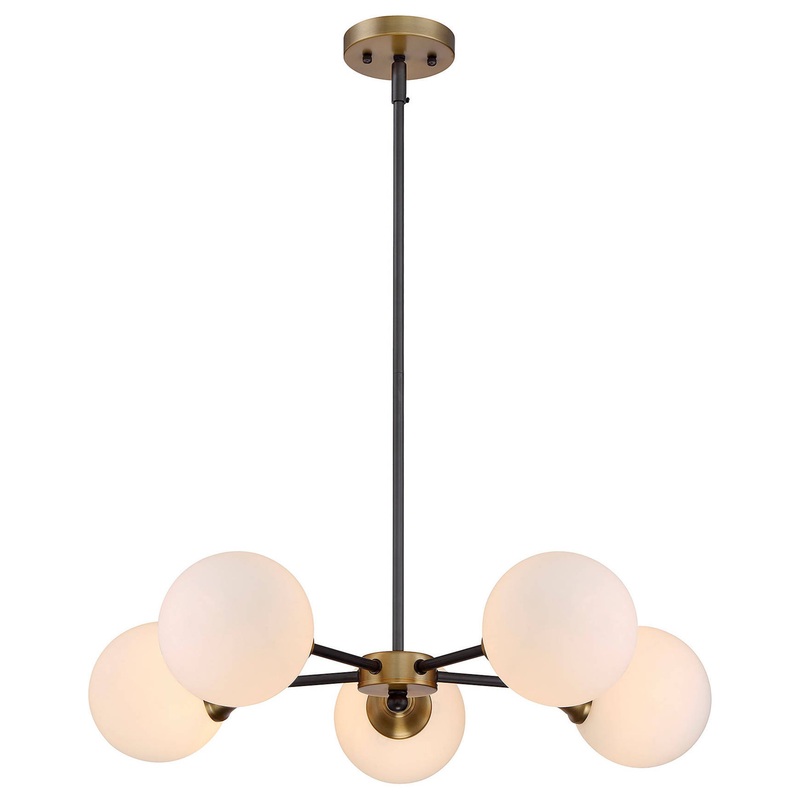 Find eye-catching midcentury style with this modish chandelier. It features a stylish two-tone blend of brass and oiled rubbed bronze finishes, paired with orbs of white opal glass. -Fixture measures 5" height -Can extend 61.25" in drop height -Includes fo