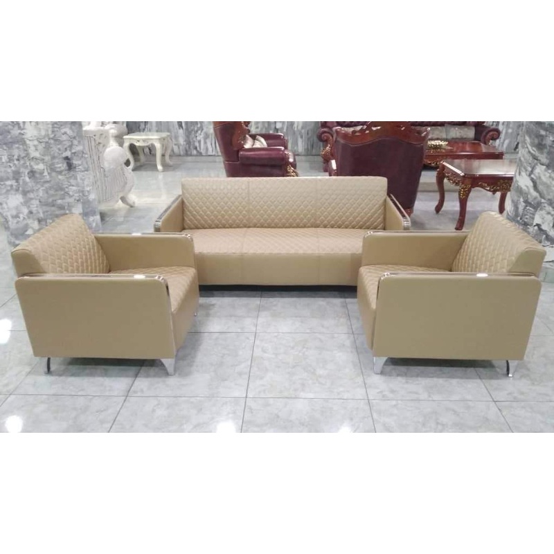 5 Seater Leather sofa set – Gold. Apply to an office or home.Slim and chrome lining armrest, hardwood embroider and leather tailored. Sofa (Seater:1+1+3)