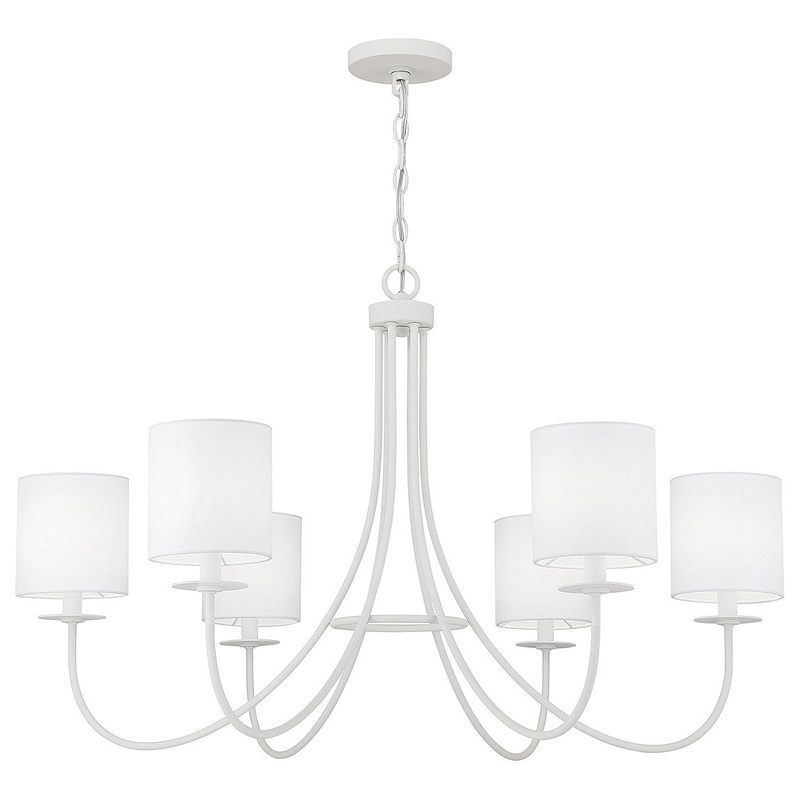 This 6-light chandelier offers up a slimmer and airier take on chandelier design with slender arms that each bear a white fabric shade. Bisque White finish. 23.50" height and 36" width. Adjustable height ranges from 24" to 143.50". Uses six candelabra size