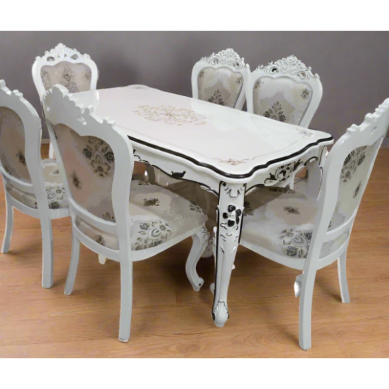 The White top and Stainless Steel Dining Table has a unique design that will enhance the natural beauty in your room and compliment your modern interior perfectly.Stainless Steel legsWood table topCurved legsSeats up to6 people6stainless steelchairs( comes