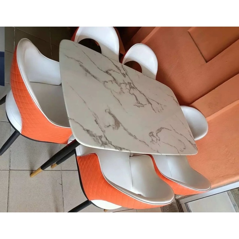 TheMarble top Dining Table has a unique design that will enhance the natural beauty in your room and compliment your modern interior perfectly.Stainless Steel Gold rim legsMarbletable topStraightlegsSeats up to6 people6 chairs( comes in various design)Dime