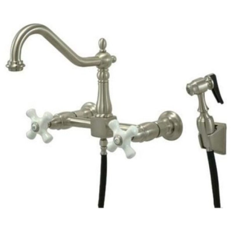 True to its name, the Heritage collection features aesthetic colonial elegance. The early American theme brings a timeless traditional design with graceful, yet attractive round curves and Victorian style spouts. This double handle kitchen faucet includes a 8″ wall mount setup with a 360-degree turn swivel hook spout. The handle moves in a 1/4-turn rotation for water volume control with a 2.2 GPM (8.3 LPM) 60 PSI max rate. Fabricated in solid brass for durability and reliance, we also provide an assortment of different finishes for stain, scratch and chipping resistance. A 10-year limited warranty is provided to the original customer. Brass sprayer included.. Manufacturer: Kingston Brass. Model: KS1248PXBS. UPC: 663370053856. Product Name: 8″ Center Wall Mount Kitchen Faucet With Wall Mounted Side Sprayer. Collection / Series: Heritage. Finish: Satin Nickel. Theme: Classic. Material: Brass. Type: Faucet. Features: Brass Sprayer Included w/ 48″ & 27″ Hoses