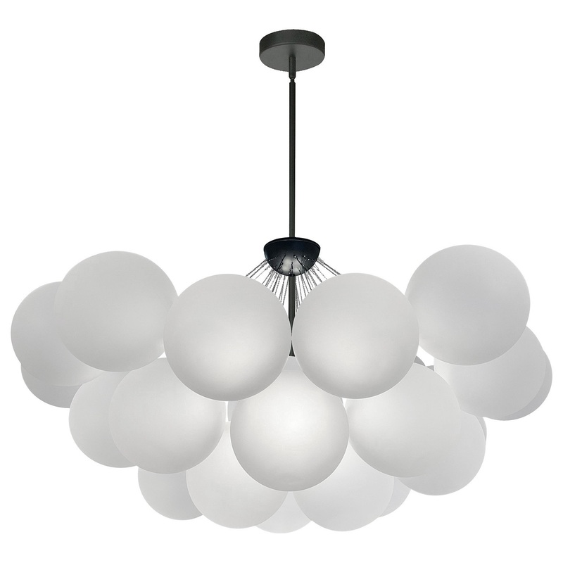 35.5" Matte Black Miles Chandelier with Frosted Glass. This 8 light LED compatible is recommended for the ceiling in a Living Room. It requires 8 Halogen G9 bulbs, is covered by a 1 Year Warranty and is suitable for either a residental or commercial space.
