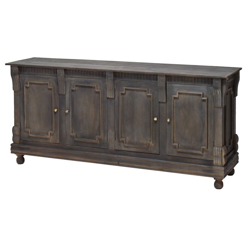 -80″ Solid Wood Hand Carved 4 Door Large Sideboard BuffetThe wood sideboard is constructed of mango timber in a water-resistant lacquer sealed “Heathered Stone” finish. Details include hand-chiseling and carving, decorative applied moldings and shaped column sections, stacked bases, and capped ball feet. Accent your hallway, living room or dining room with this beautiful sideboard. Features spacious shelved interior behind doors, hand-crafted classic design, and makes a beautiful addition to your home.