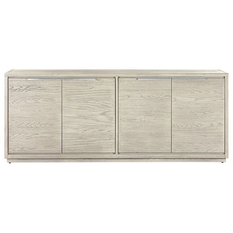 Add stylish and functional storage solution to your home with Abbey silver grey oak 4 door sideboard and buffet. The modern and streamlined look of the sideboard allows focusing on the rich organic grains of Oak. Completed with a sleek silver-grey finish, the sideboard can bring effortless style to any dead corner of your home. The Abbey features brushed stainless steel handles that complement this dining room console cabinet. With a timeless and versatile design, our 4-door sideboard can easily transition from a buffet to a media, office cabinet, or entryway storage unit. Oak is a highly durable hardwood used for thousands of years. It has a unique grain pattern derived from the rings of the oak tree. It contains high levels of tannins, allowing the wood to resist insects, mold, and fungus naturally. This serving buffet features plenty of storage with its 4 doors and shelves to become your perfect entertaining companion at brunches and holiday.