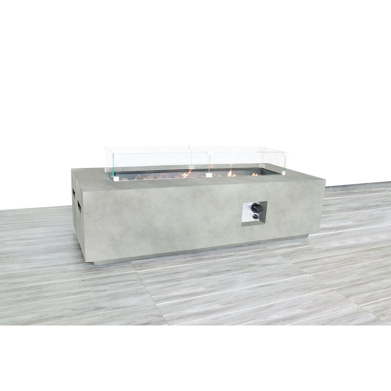 ather your friends and family around an open fire with this fire pit! Complete with a tank holder, this compact design brings you the cozy ambience of flickering flames without lugging bulky fire pits, changing logs, or shoveling soot. This fire pit tables rectangular silhouette is made from concrete and features a glass flame guard that adds contemporary style to your outdoor arrangement. The push-button ignition outputs 50,000 BTUs of heat lava rock fill is included and the flames are adjustable. This weather-resistant fire pit table stands up to rain and wind, and requires propane for year-round use. Plus, it comes with a handy nylon cover to keep it protected.What’s Included?FillerCoverProduct DetailsProduct Type: Fire pit tableExterior Material: Fiber Reinforced ConcreteSafe for Use on Wooden Deck: Can be placed directly on wooden deckFuel Type: Propane; Natural gasBTU Output: 60000 BTUGas Conversion FeatureGas Conversion Kit Included: No