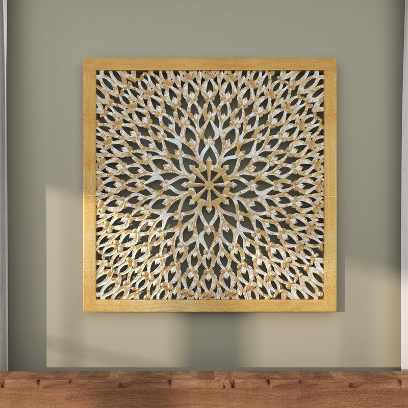 This wall dcor has a weathered finish and carved detailing that’s bound to make a French country style statement on any of your walls, from the living room to the bedroom. It’s made in India from solid pine wood with a gold and tan hue, and it features a clean-lined, square silhouette. This piece is accented with ornate cutout carvings and a mandala-inspired pattern in the middle for traditional appeal. It also stands 36″ tall, so it’s ideal on its own or paired together with other artwork. Plus, this piece comes with wall-mounting hardware for easy installation on any wall. Hand-curated by Kelly Clarkson. Kelly Clarkson Home Size: 36″ H x 36″ W x 1″ D